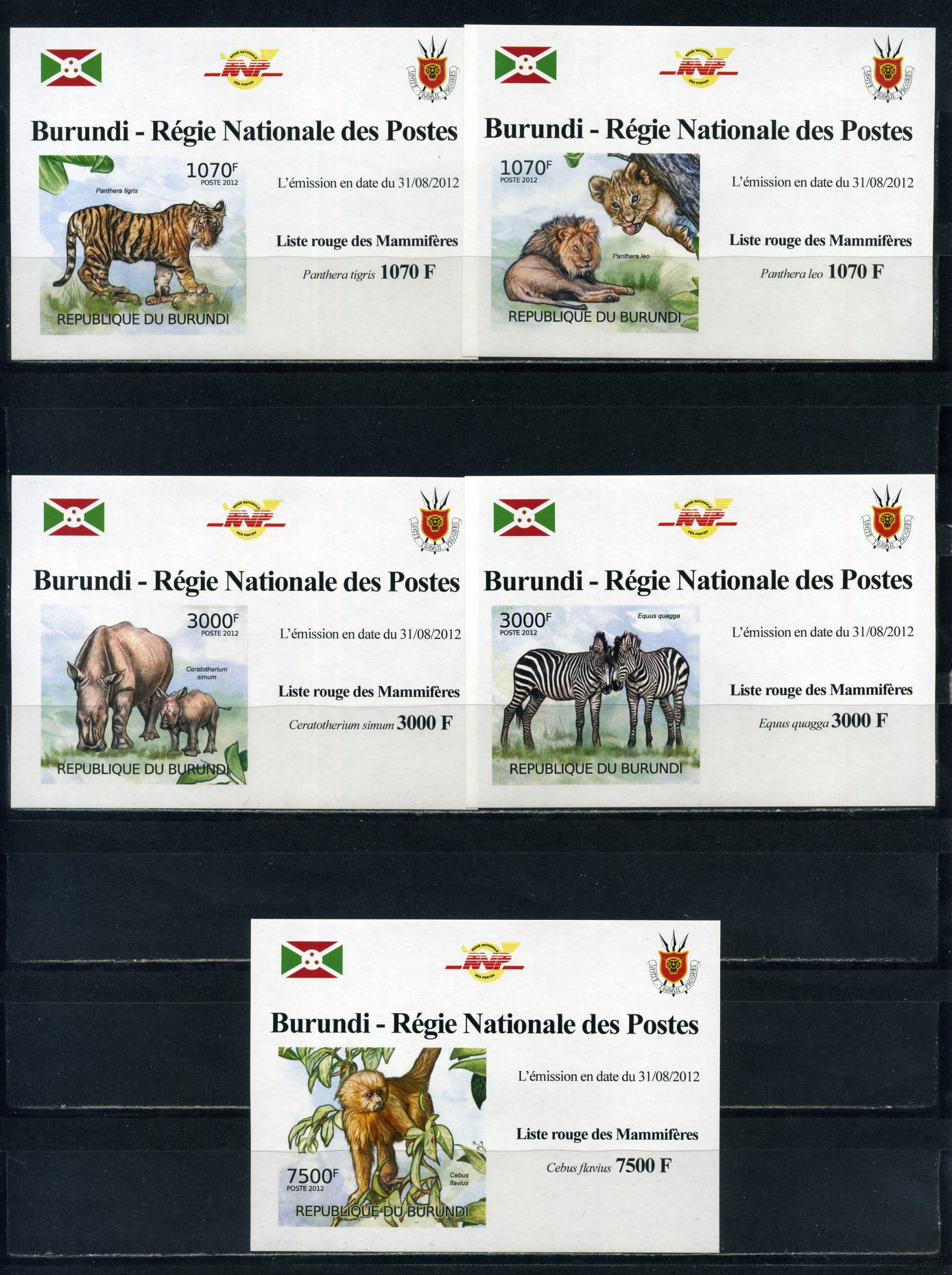 Почтовые марки. Бурунди. 2012г. Млекопитающие. Люкс-блоки. №2625В-2629В. Беззубц.