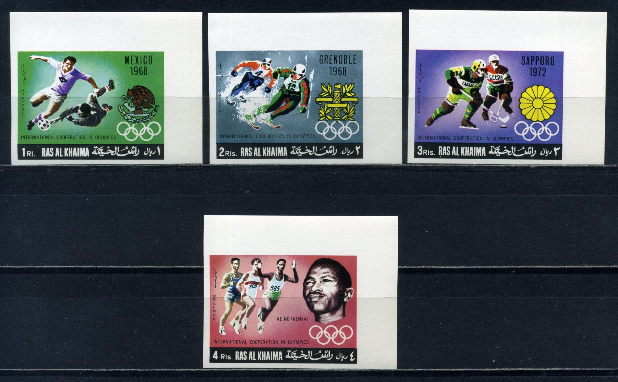 Почтовые марки. Рас-эль-Хайма. 1969г. Олимп.игры. Футбол. №312в-315в. Беззубц.
