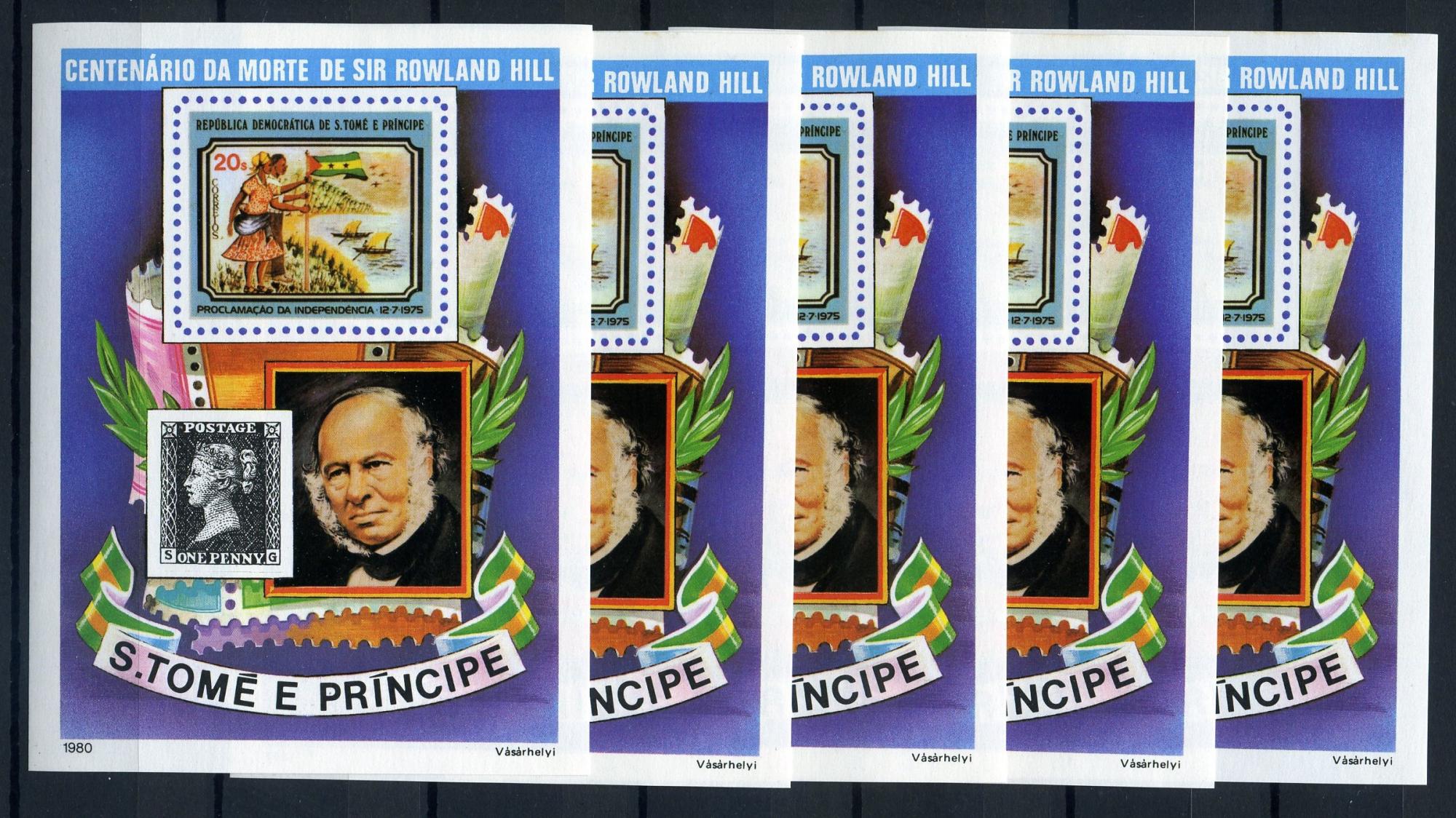 Почтовые марки. Сан-Томе и Принсипи 1980 г.Сэр Роуленд Хилл и марки (Mi:ST 429) Bl44. 5 блоков