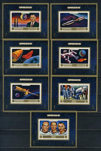 Почтовые марки. Манама. 1972г. Космос. Аполлон-16. Астронавты. №746-752. Люкс-блоки.