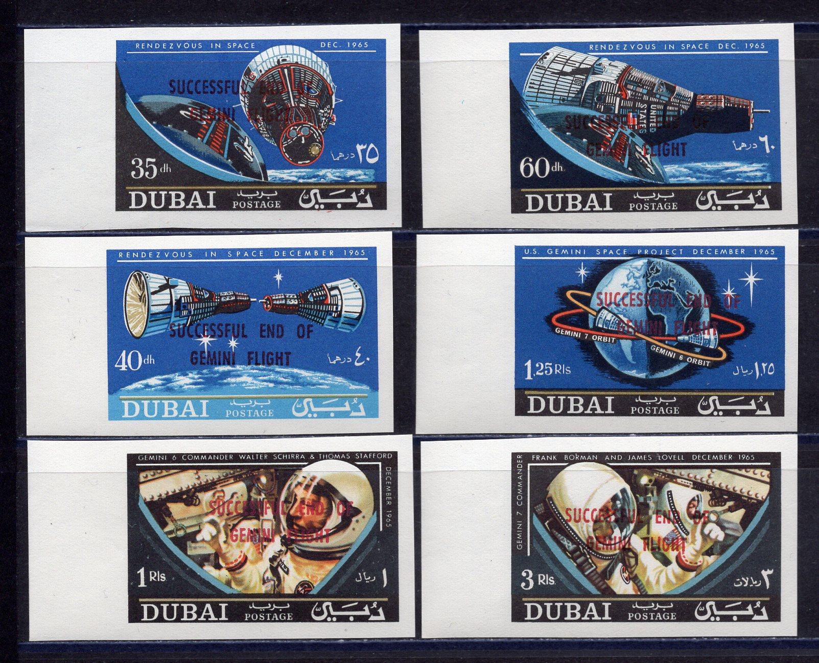 Почтовые марки. Дубай 1967г. Космос. Надпечатка Джемини-6. №237В-242В. Беззубц. (Mi : 25.00 Euro)