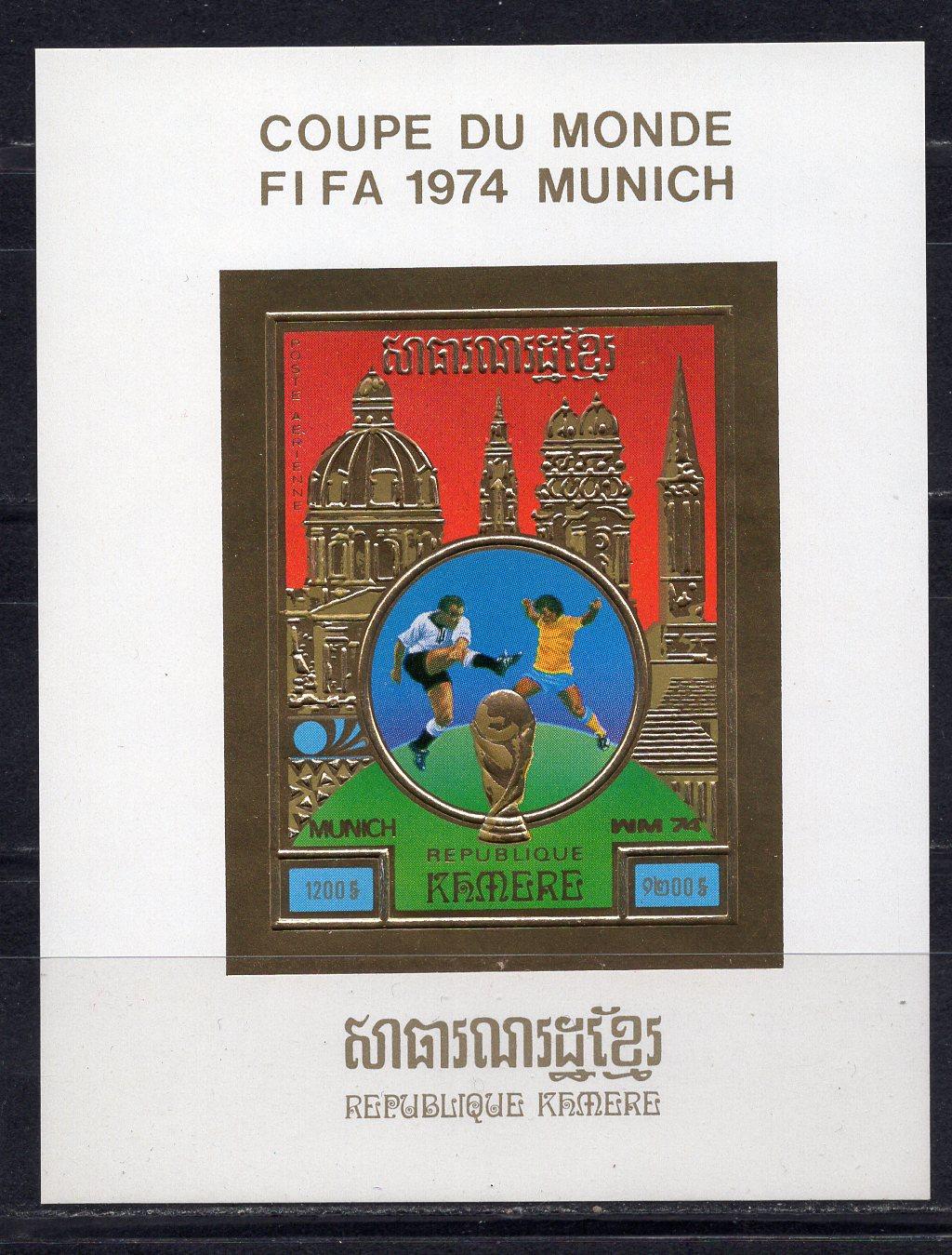 Почтовые марки. Камбоджа, 1975 г. Футбол. Бл. 103В. Безз. Фольга. Золото. (Mi 80,00 €)