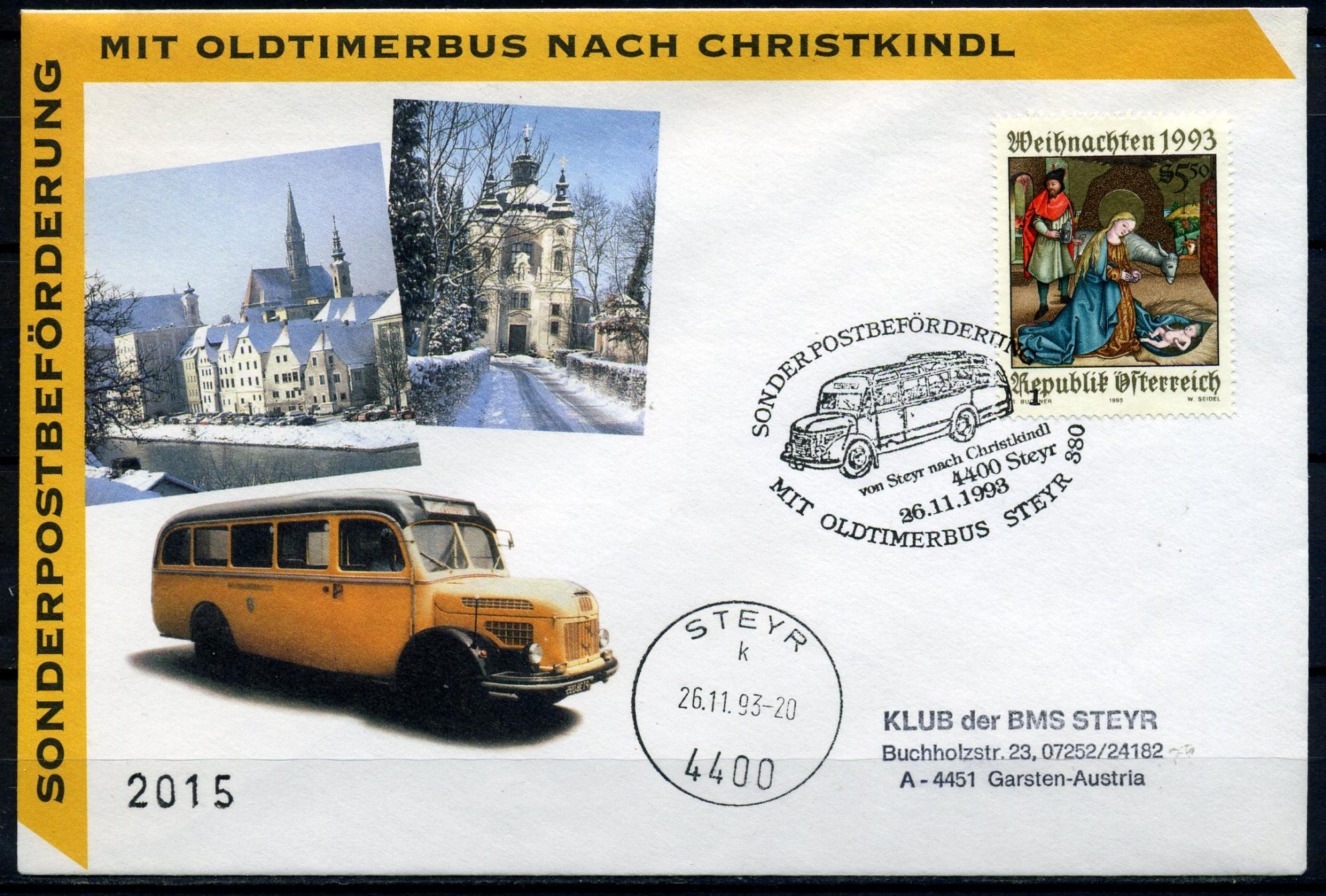 Конверт с маркой и СГ. Австрия 1993 г. Спец.почтовое отправление на старинном автобусе. КО.