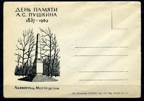 Конверт. СССР 1962 г. Ленинград. Место дуэли А.С. Пушкина. КЗ.