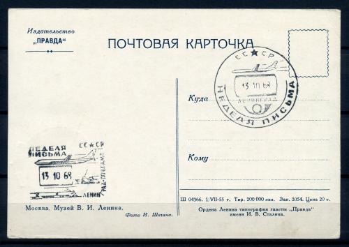 Почтовая карточка с маркой и СГ. СССР 1968 г. Неделя письма.