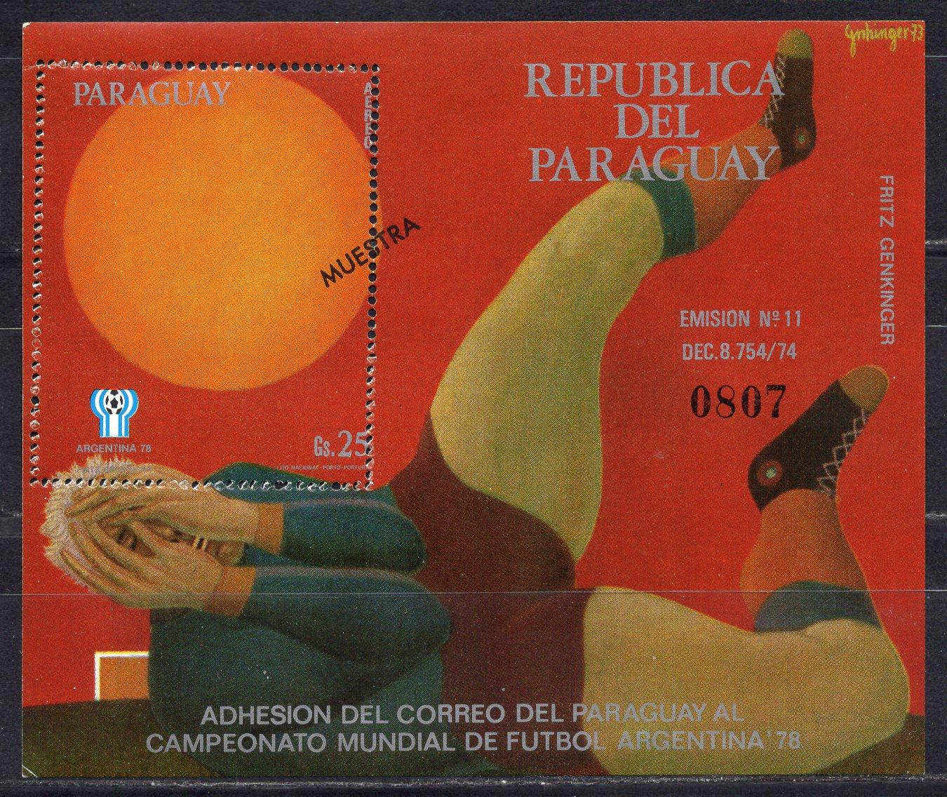 Почтовые марки. Парагвай, 1977 г. Бл. 310. Футбол. Надпечатка. Muestra. (Mi 40.0 e)