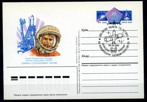 Почтовая карточка с ОМ и СГ. СССР 1986 г. 25-летие полета Г.С. Титова.