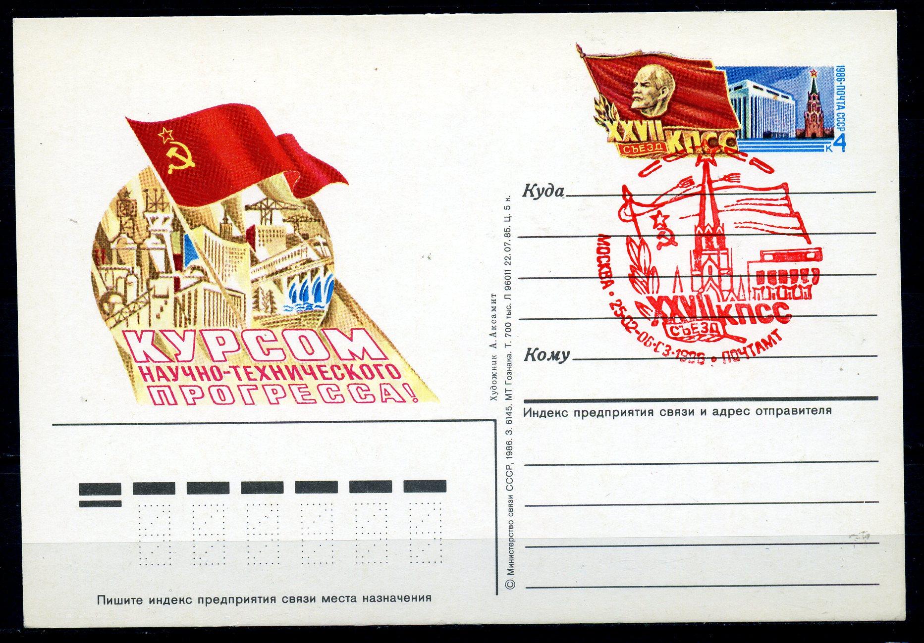 Почтовая карточка с ОМ и СГ. СССР 1986 г. XXVII съезд КПСС.