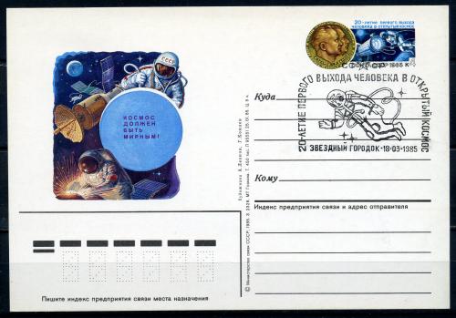 Почтовая карточка с ОМ и СГ. СССР 1985 г. 20-летие первого выхода человека в открытый космос.