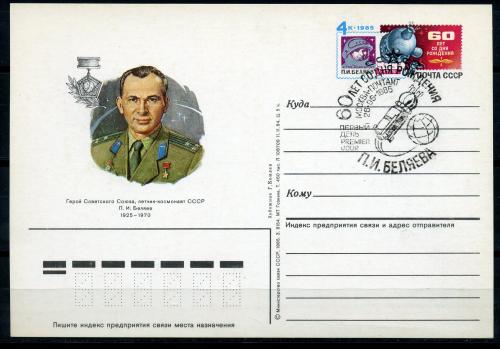 Почтовая карточка с ОМ и СГ. СССР 1985 г. 60-летие со ДР летчика-космонавта П.И.Беляева.