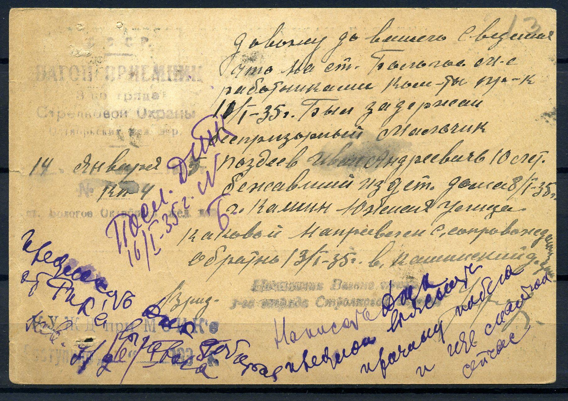 Почтовая, подписанная карточка, прошедшая почту. СССР 1935г. См. Текст- о задержании беспризорника.