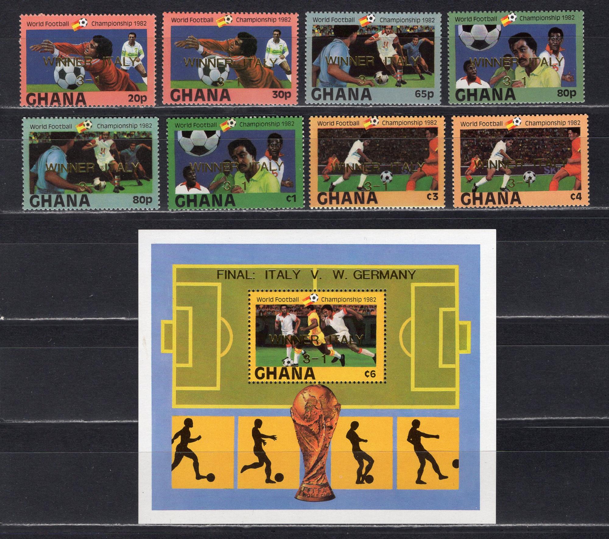 Почтовые марки. Гана. 1983г. Футбол. Надпечатка. №968-975. Блок №99 (Mi: 18.50 Евро)