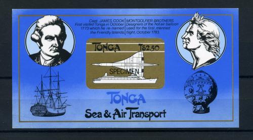 Почтовые марки. Тонга. 1983г. Морской и воздушный транспорт. Блок №4. Самоклейка. Надпечатка SPECIMEN.
