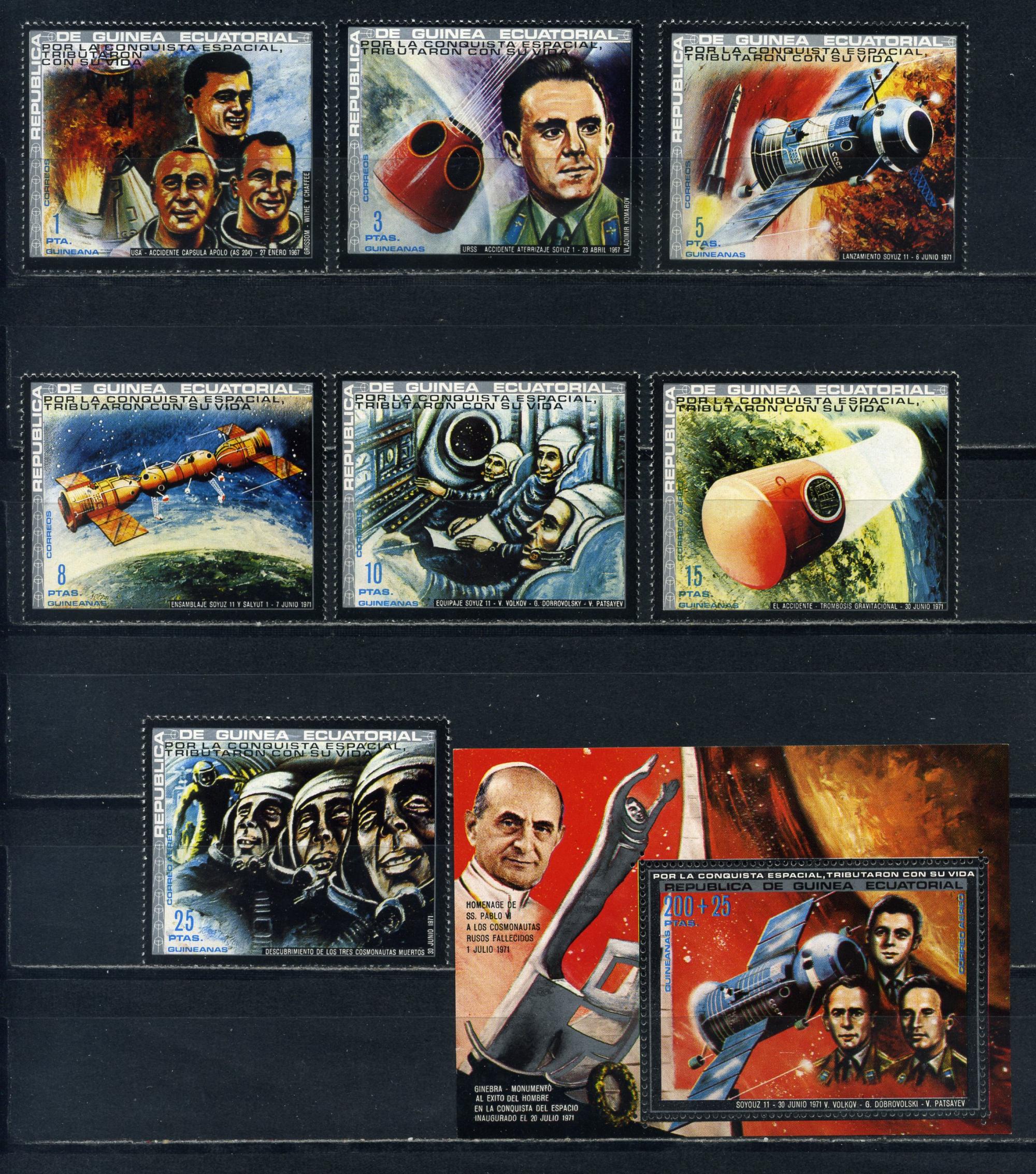 Почтовые марки. Экваториальная Гвинея. 1972г. Космос. Погибшие экипажи. №190-196. Блок №51.