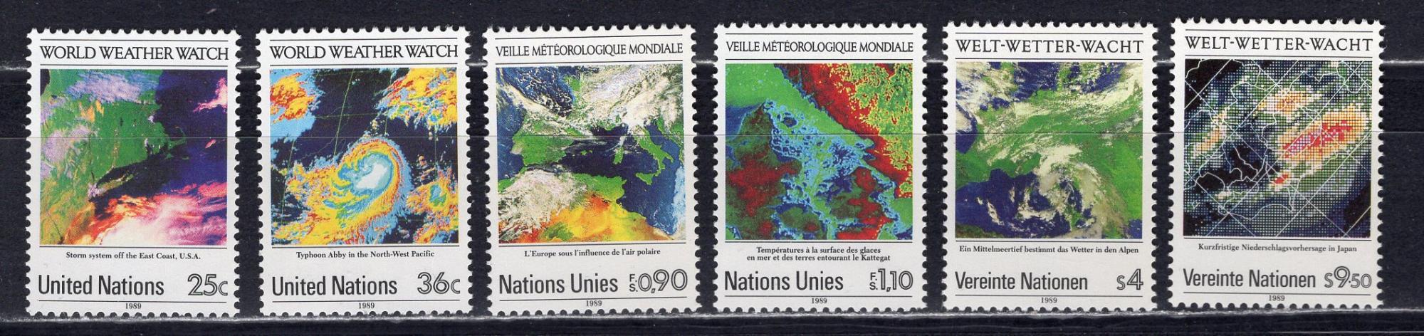 Почтовые марки. ООН. Женева. Вена. Нью-Йорк. 1989г. Космос. Метеорология. №92-93.176-177.575-576. 3 серии. Комплект.