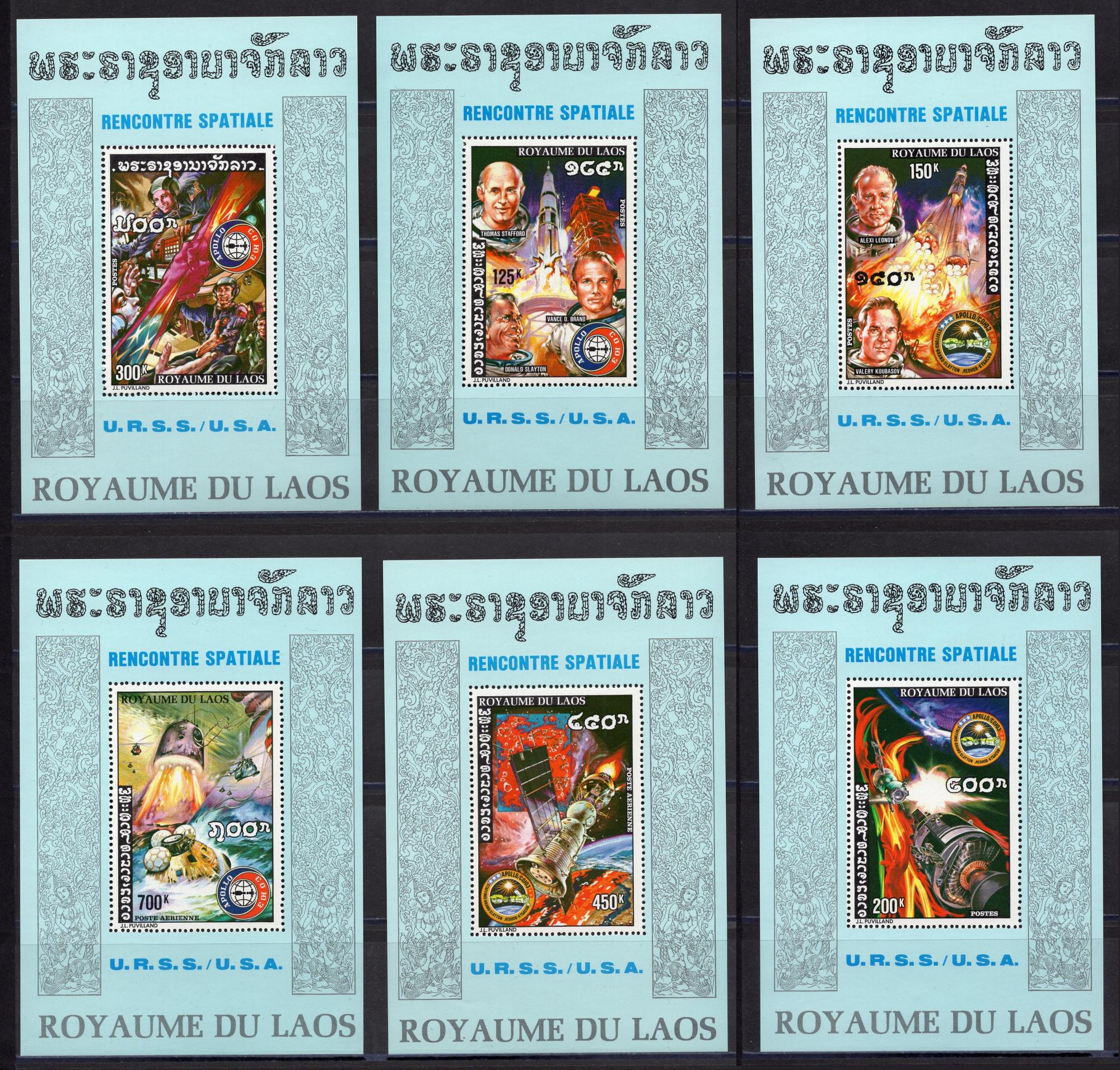 Почтовые марки. Лаос. 1975г. Космос. СОЮЗ-Аполлон. Комплект. Блок №65-70.