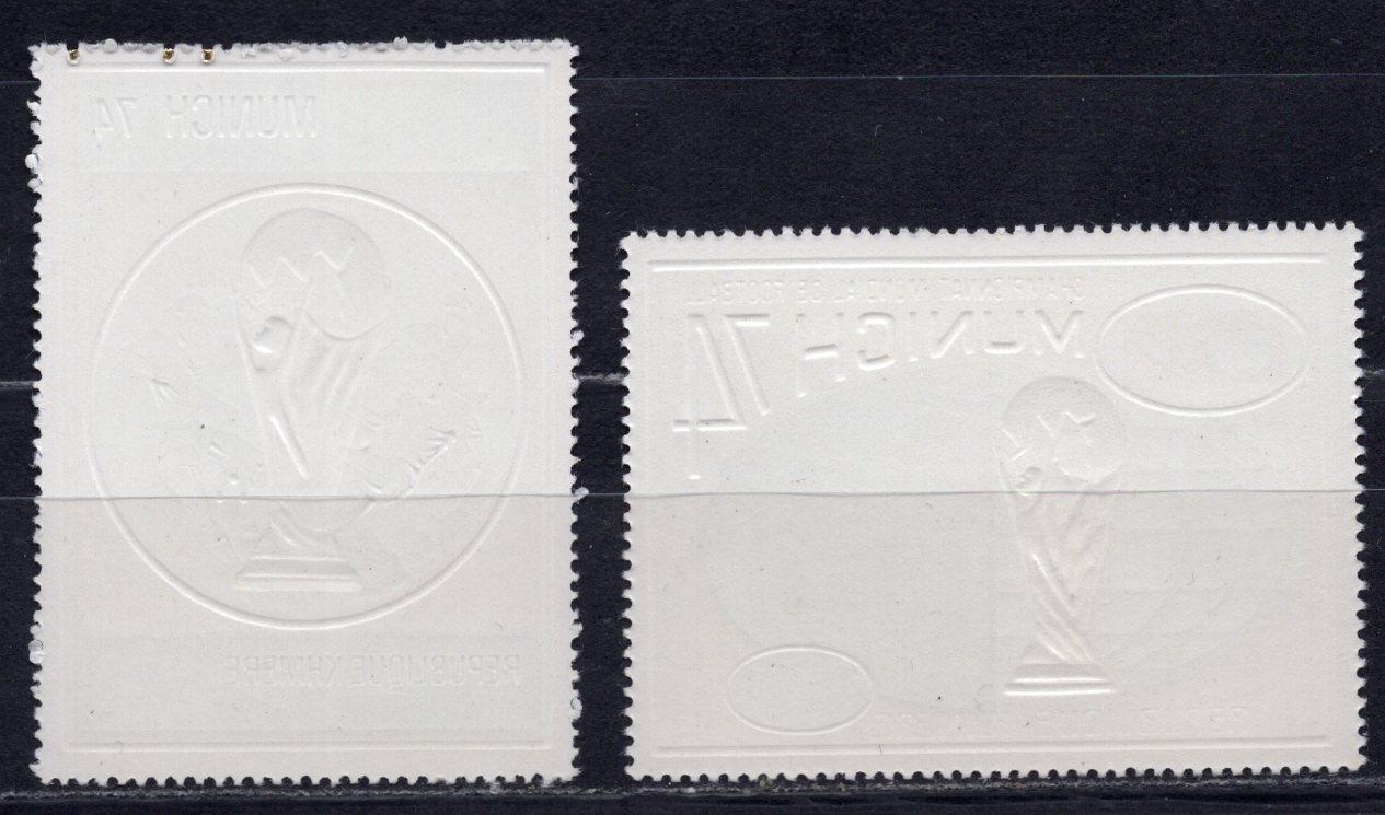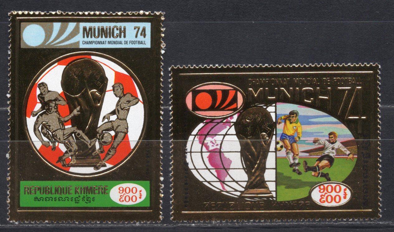 Почтовые марки. Камбоджа, 1973 г. №384-385А. Чемпионат мира по футболу, ФРГ. Фольга. Золото. (Mi 100,00 €)