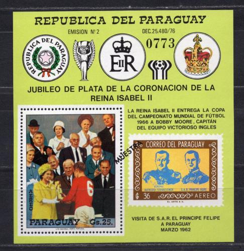 Почтовые марки. Парагвай, 1978 г. Бл. 321. 25-я годовщина коронации королевы Елизаветы II; Чемпионат мира по футболу FIFA в Аргентине. (Mi 25.0 e)