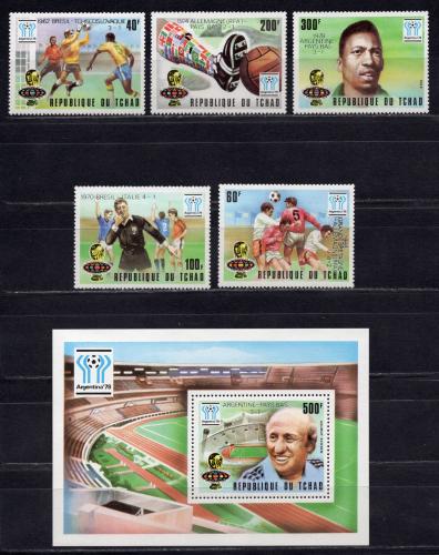 Почтовые марки. Чад, 1978 г. №841-845. Бл. 74. Футбол. Надпечатка. (Mi 15.0 e)