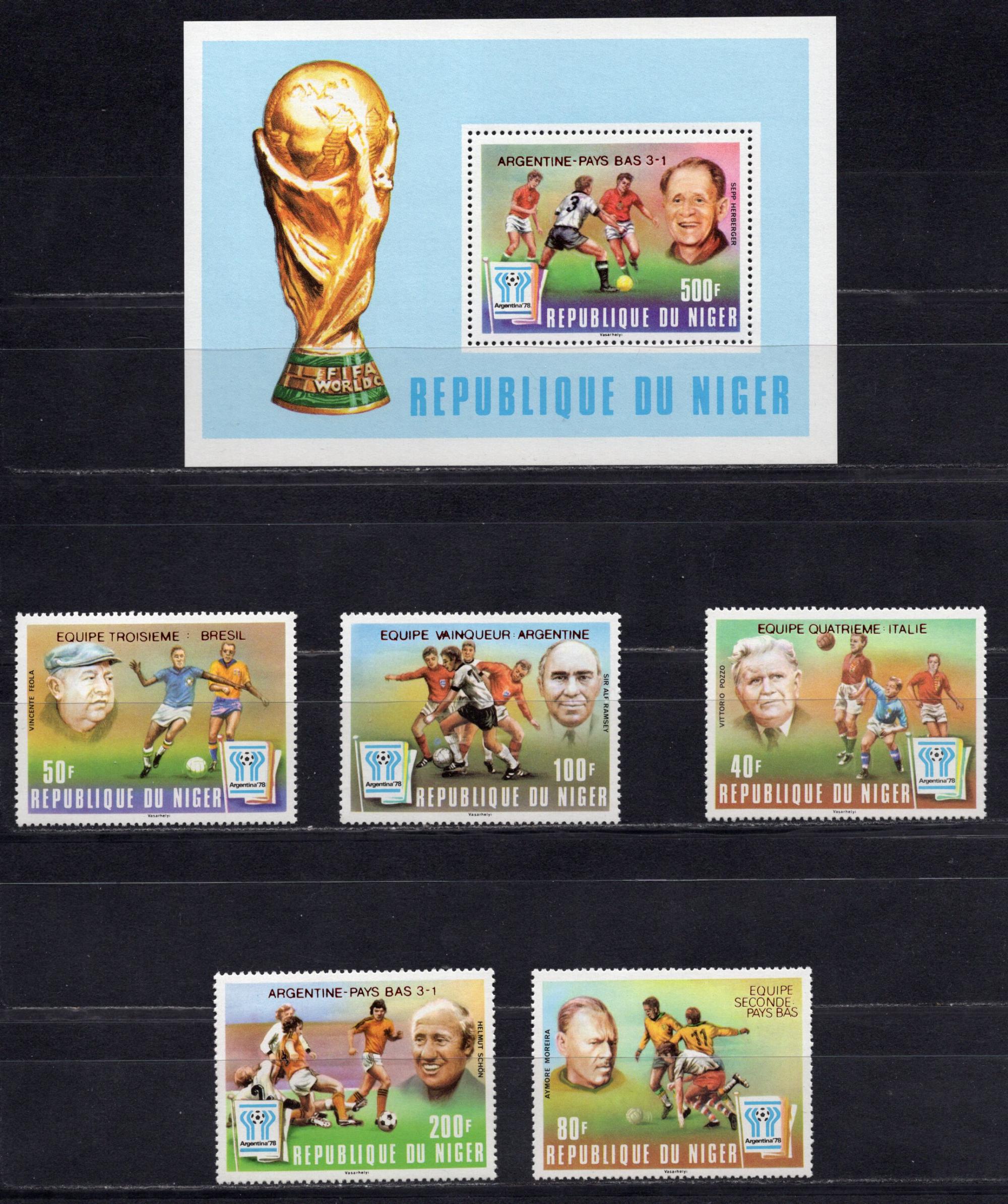 Почтовые марки. Нигер, 1978 г. №639-43. Бл.21. Футбол. Надпечатка КРАСНАЯ.