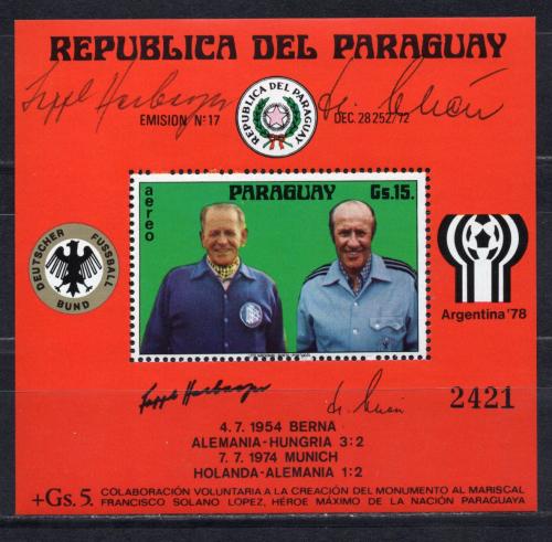 Почтовые марки. Парагвай, 1976 г. Бл. 269. Футбол. Германия. (Mi 50.0 e) ЛИЧНЫЕ АВТОГРАФЫ: Зепп Хербергер (54г.) и Гельмут Шён (74г.) RRR !