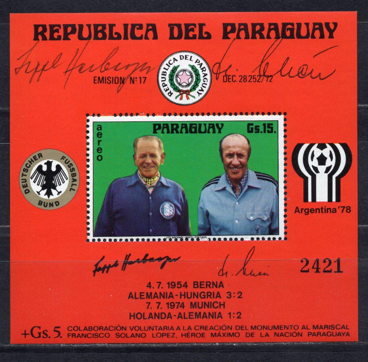 Почтовые марки. Парагвай, 1976 г. Бл. 269. Футбол. Германия. (Mi 50.0 e) ЛИЧНЫЕ АВТОГРАФЫ: Зепп Хербергер (54г.) и Гельмут Шён (74г.) RRR !