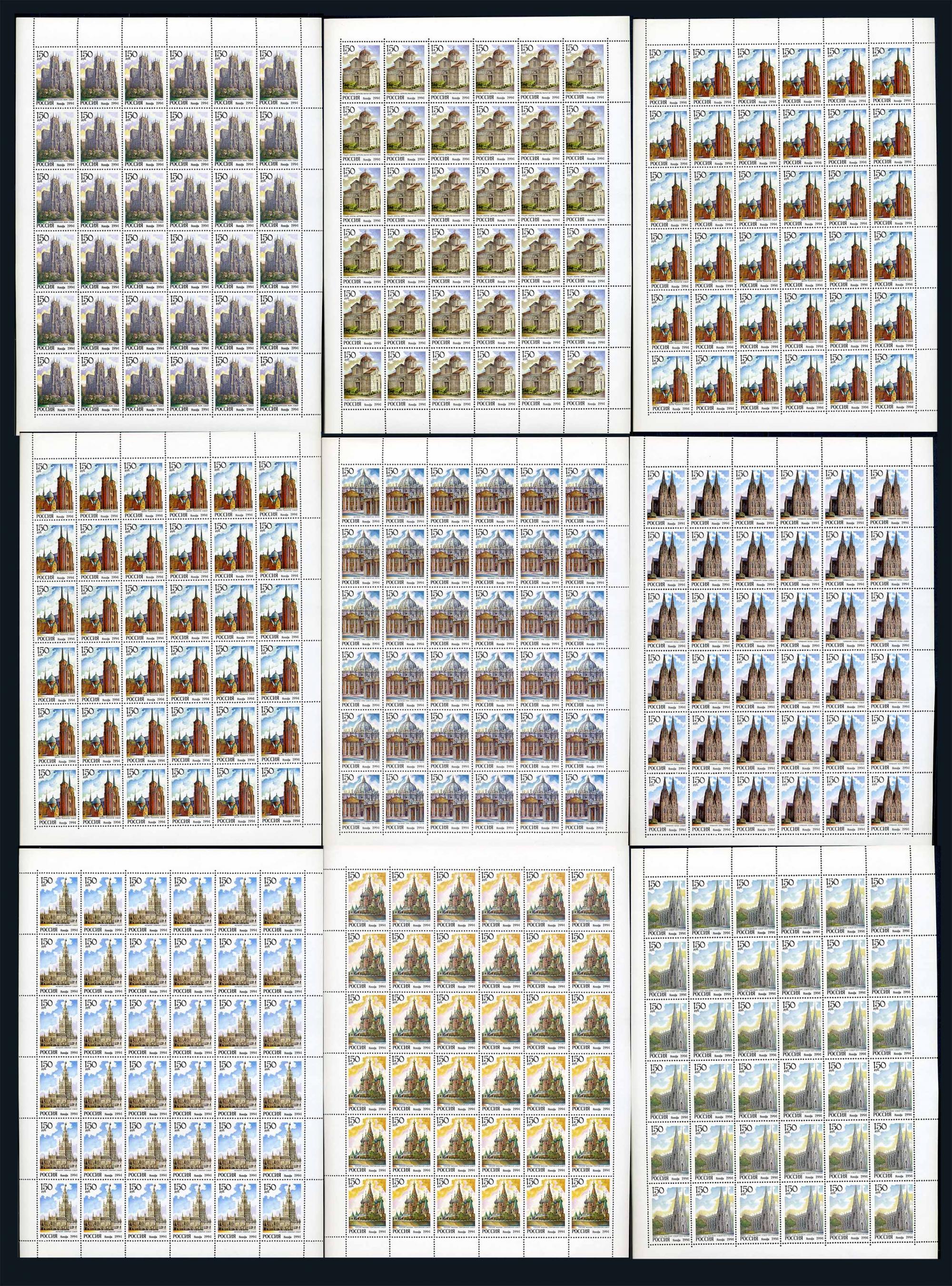 Почтовые марки. Россия 1994 г. Соборы мира. № 149-157. Комплект в листах (Кат. Заг.: 160р./сер.).