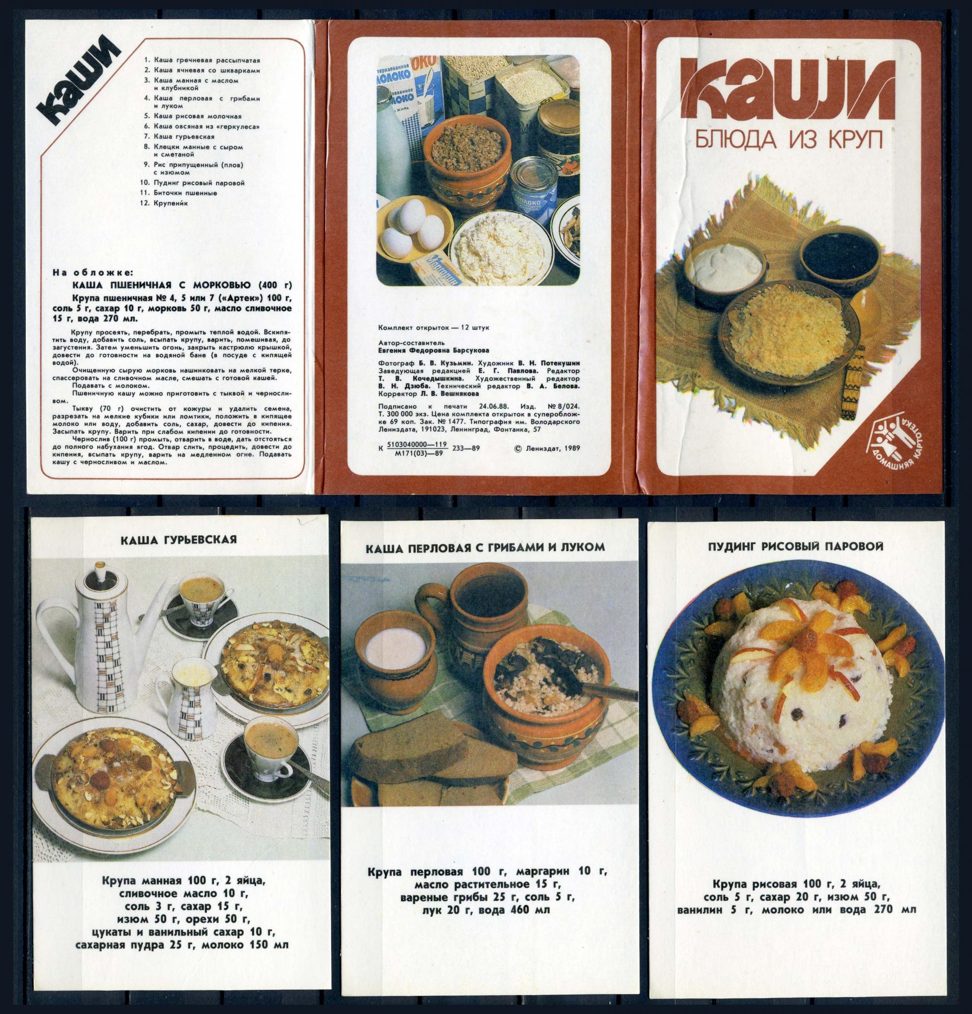 Комплект открыток. СССР 1989 г. Каши. Блюда из круп.12 открыток (полный).