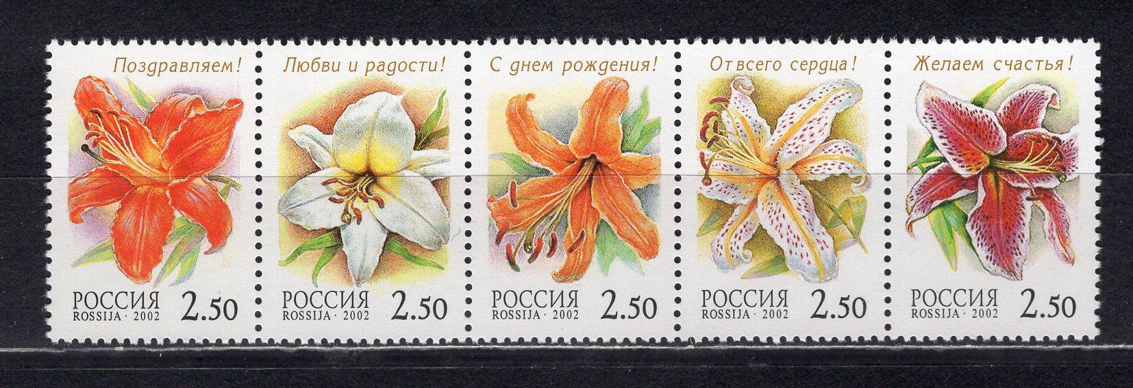 Почтовые марки. Россия. 2002г. Лилии. Пожелания. №734-738. Сцепка.