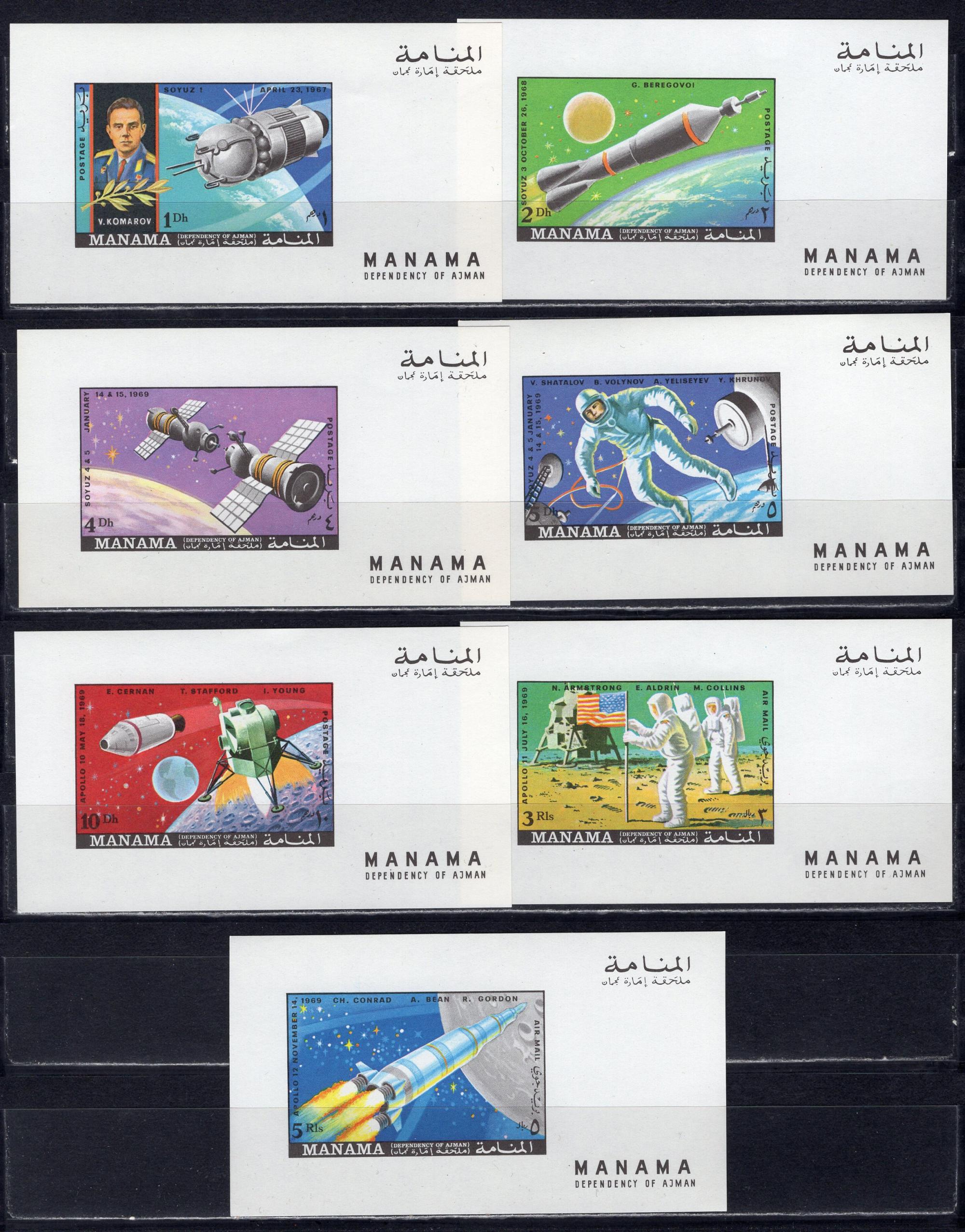 Почтовые марки. Манама. 1970г. Космос. Программа Союз-Аполлон. Люкс-блоки. №244в-250в. Беззубц. (см.состояние)