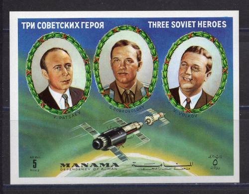Почтовые марки. Манама. 1972г. Космос. Три советских героя. Блок №201. Беззубц. (Mi: 9.00 Евро)
