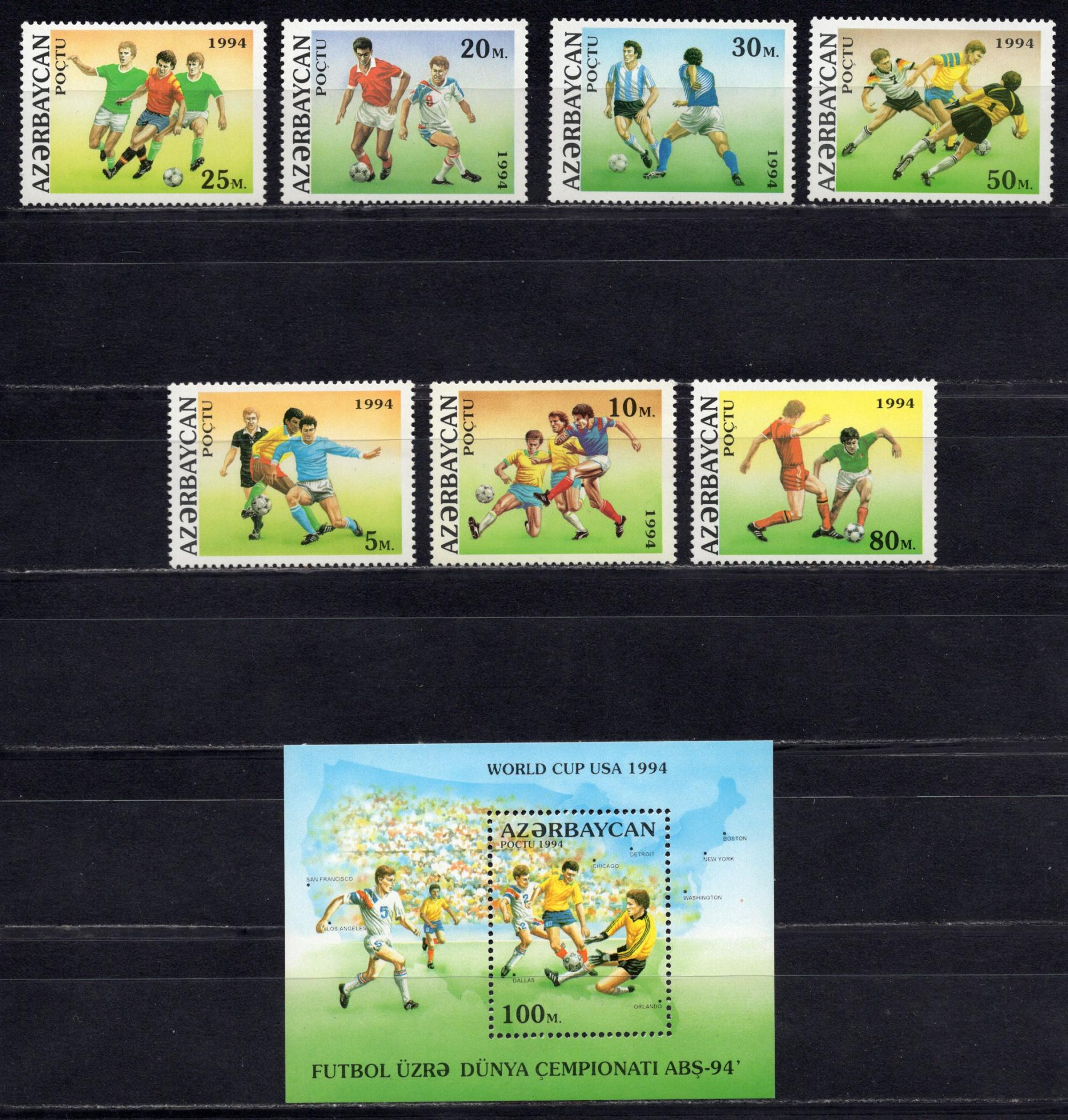 Почтовые марки. Азербайджан, 1994 г. № 140-146, Бл. 147. Футбол.