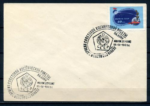 Конверт с маркой и СГ. СССР 1960 г. 1-я годовщина запуска космической ракеты на Луну. КО.