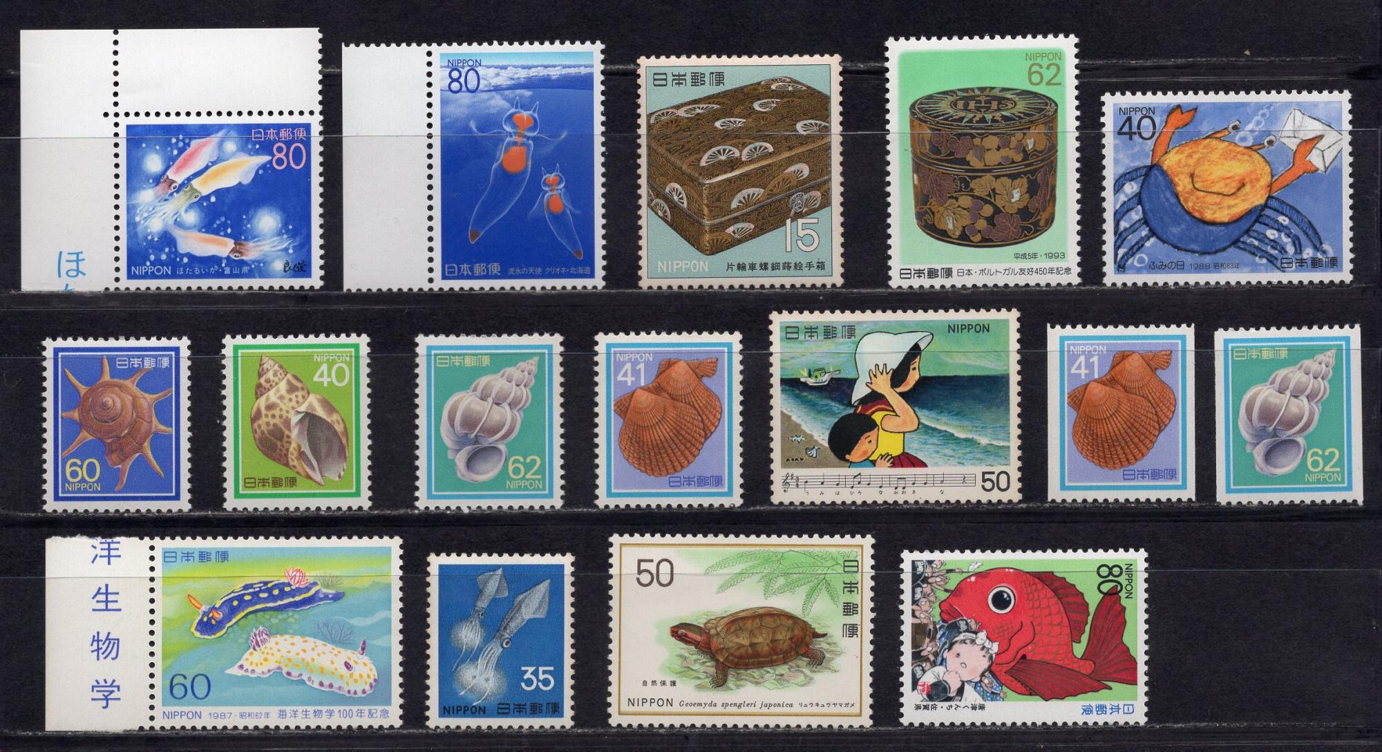 Почтовые марки. Япония, 1976-1999. Сборный лот. № 1281, 2667, etc. Рыбы. Ракушки.