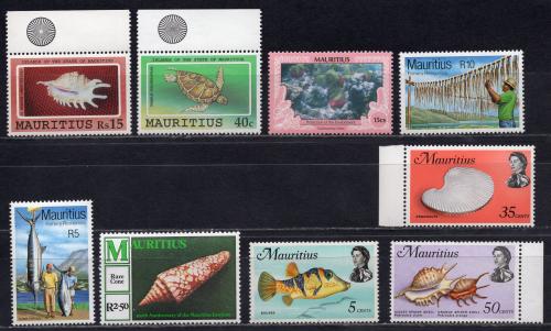 Почтовые марки. Маврикий, 1969-1991 г. Сборный лот. №505, 334 etc. Ракушки. Рыбы. Морской промысел.