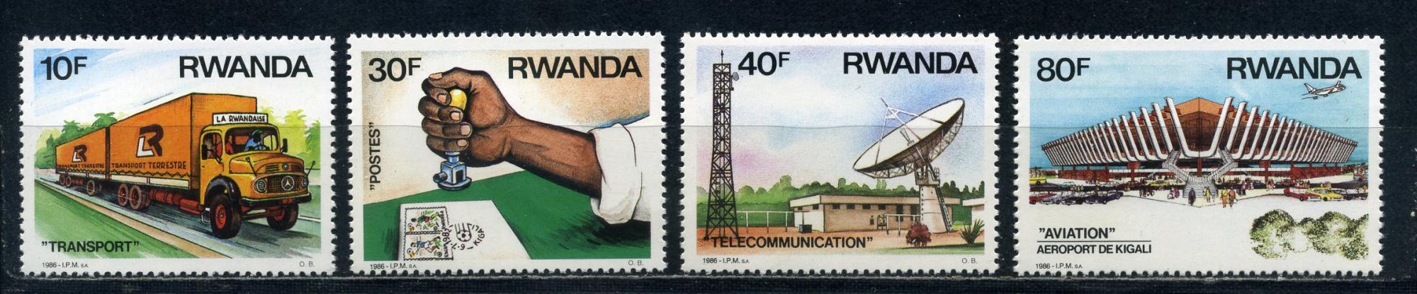 Почтовые марки. Руанда. 1986г. Транспорт. Почта. Телеком. №1327-1330.