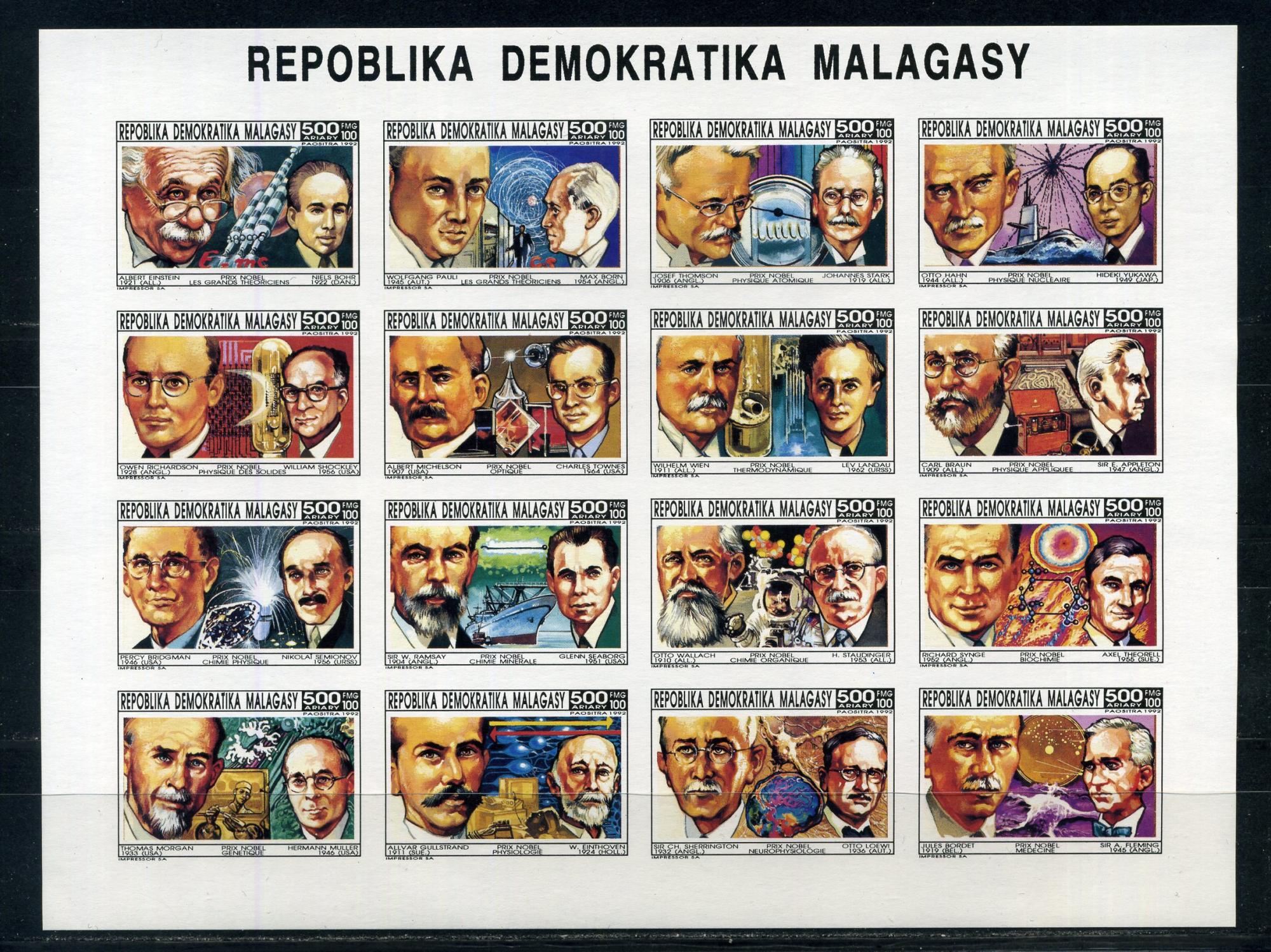Почтовые марки. Мадагаскар. 1993г. Нобелевские лауреаты. №1430в-1445в. Беззубц.