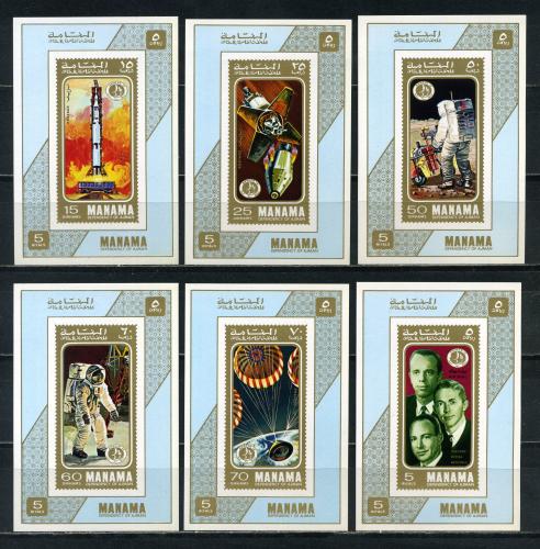 Почтовые марки. Манама. 1971г. Космос. Аполло-14. Люкс-блоки. №412-417. Беззубц.