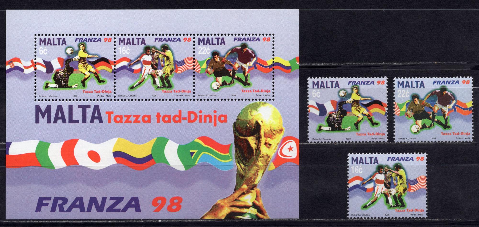 Почтовые марки. Мальта, 1998 г. №1047-1049. Бл. 17. Футбол.