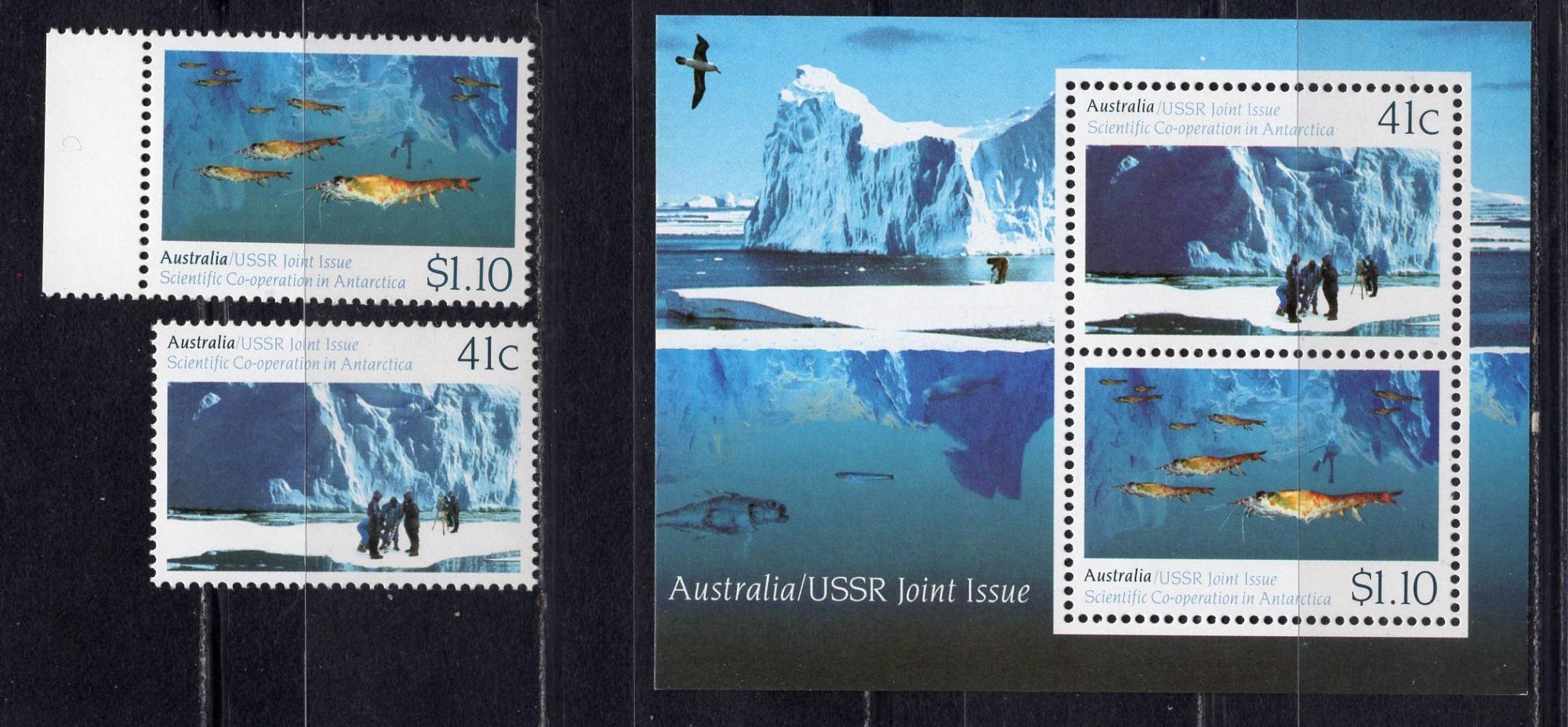 Почтовые марки. Австралия, 1990 г. Совместный выпуск с СССР. №1215, 1216. Бл. 11. Антарктика.