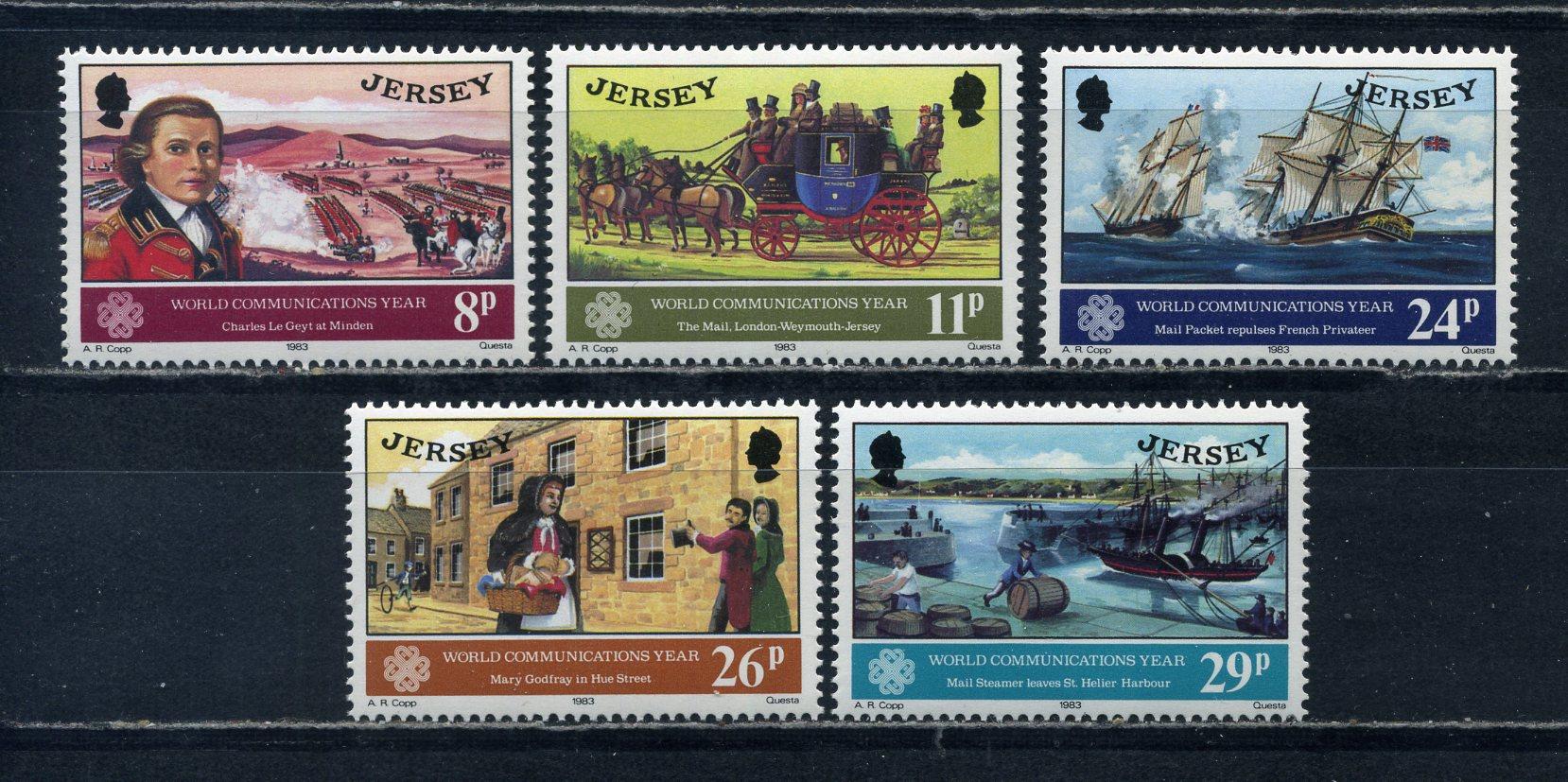 Почтовые марки. Джерси. 1983г. Год связи. Почта. Корабли. №303-307.