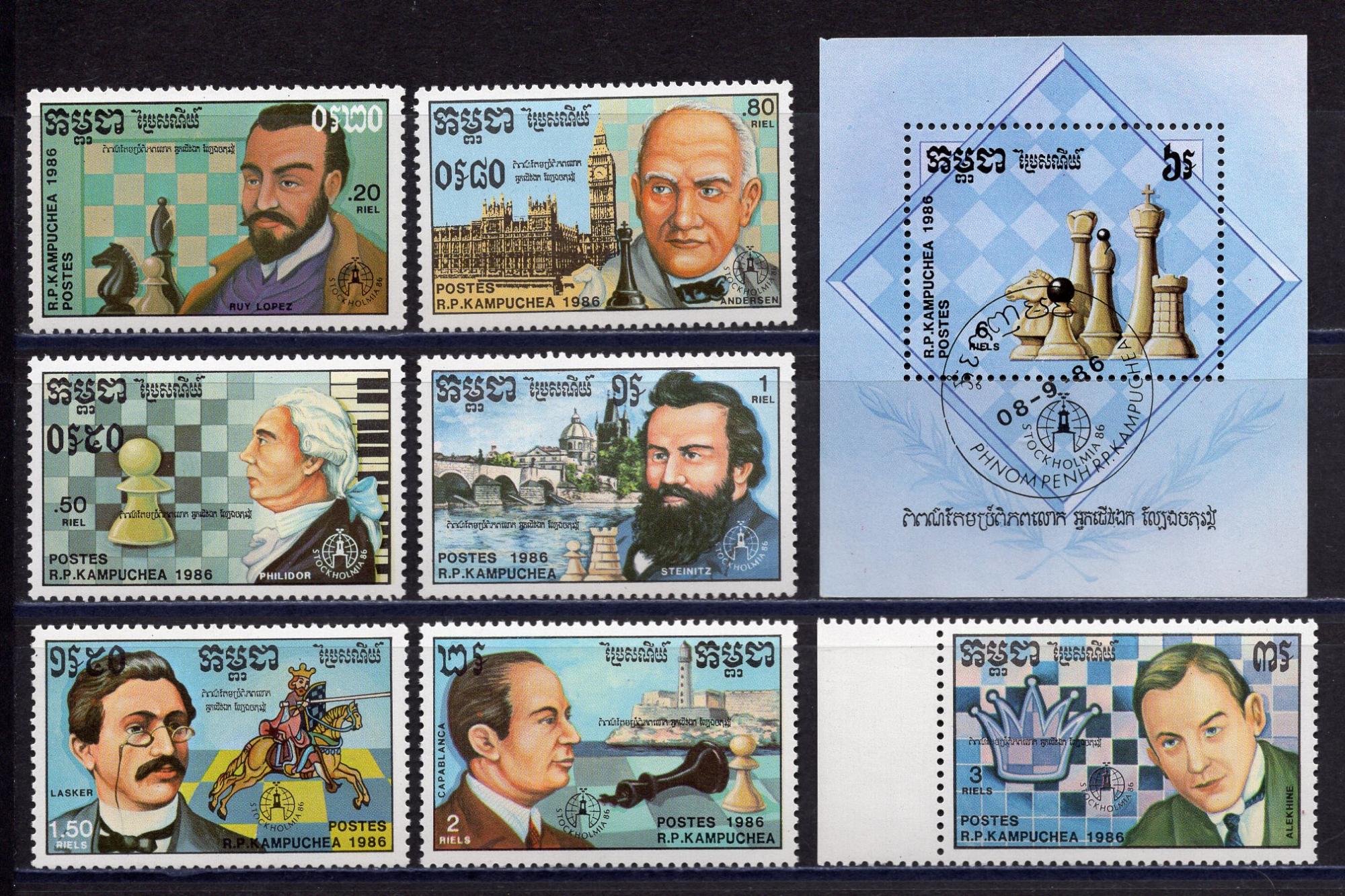 Почтовые марки. Кампугия. 1986г. Шахматы. №791-797 Чист. Блок №149 (№798) Гаш.