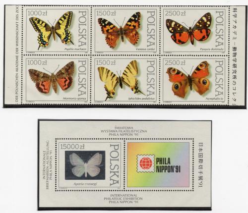 Почтовые марки. Польша, 1991 г. №3343-3348; Бл.115. Бабочки. Филвыставка 1991 г.