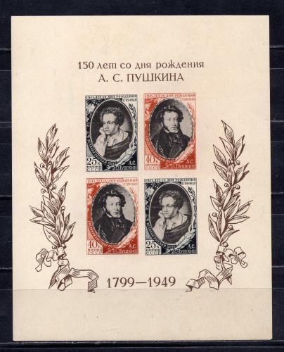 Почтовые марки. СССР, 1949 г. Бл. 1405. 150 лет со Дня рождения А.С. Пушкина. (7000 руб.)