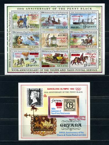 Почтовые марки. Гайана. 1990г. Р.Хилл. Открытие Америки. Олимпиада. Надпечатка красная. №3126-3134. Блок №85.