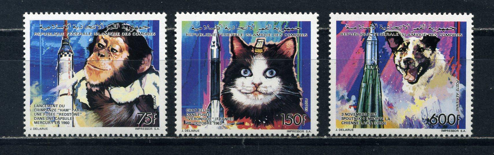 Почтовые марки. Коморы. 1992г. Животные в Космосе. №989 etс.