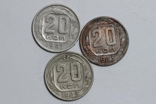 Монеты СССР. 20 копеек 1941-1945 г. 3 шт.