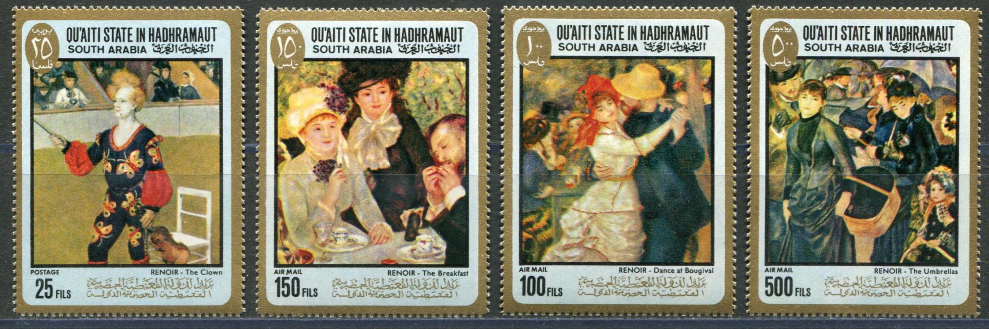 Почтовые марки. Аден Qu'aiti. 1967г. Живопись. Ренуар. №142-145.