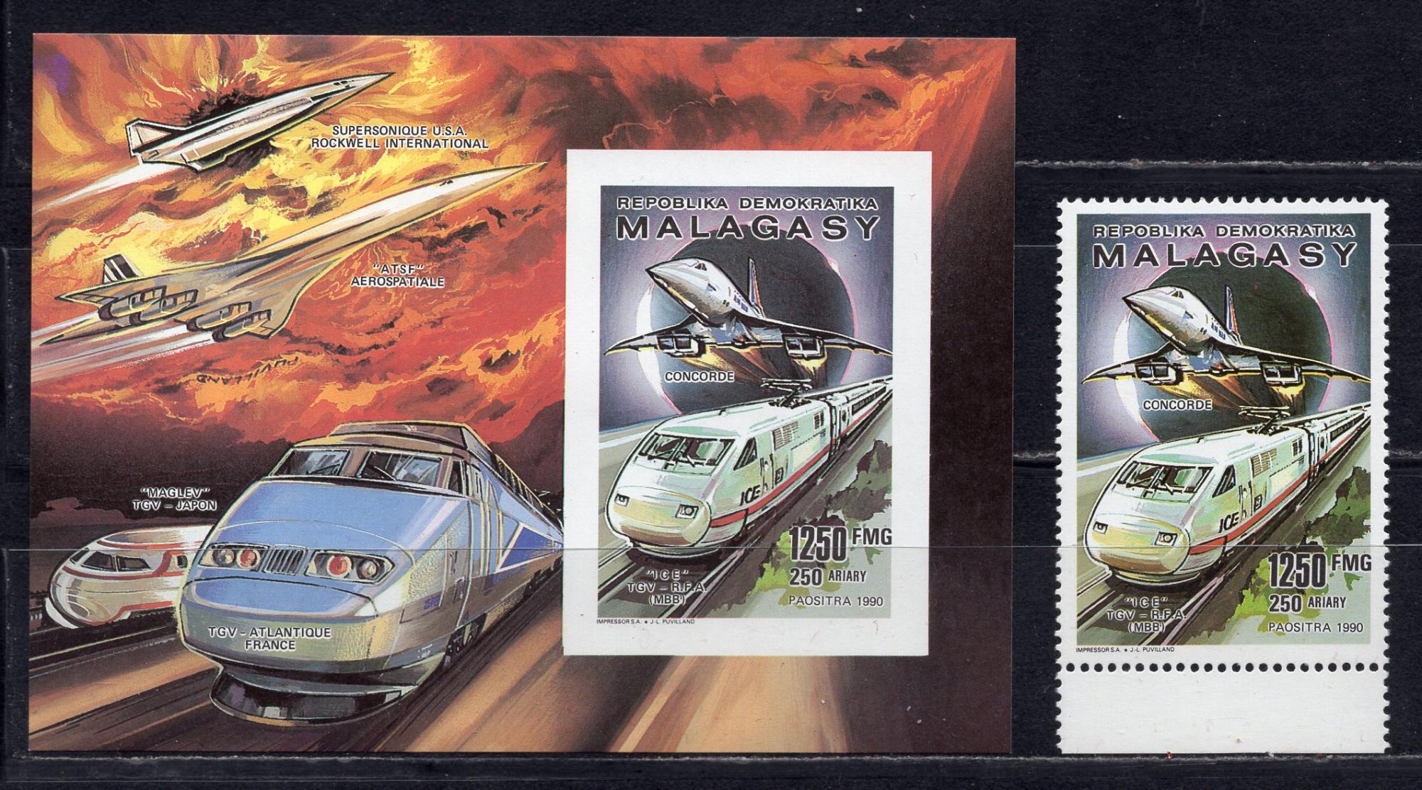 Почтовые марки. Мадагаскар. 1990. Самолёты. Локомотив. Бл. 152В + №1285.