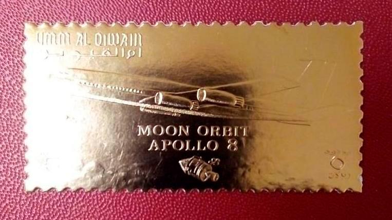 Почтовые марки. Умм-эль-Кайвайн. 1969. Космос. Аполлон-8. Самолёт. Фольга. Золото. № 409А (Mi: 12.00 Евро).